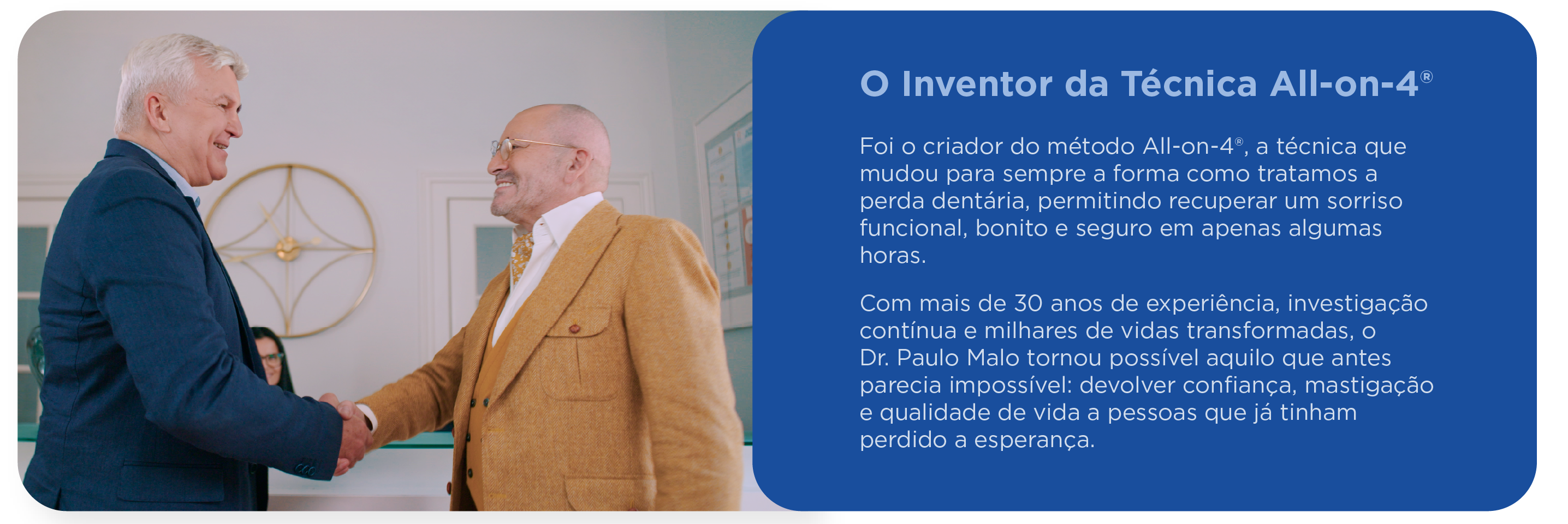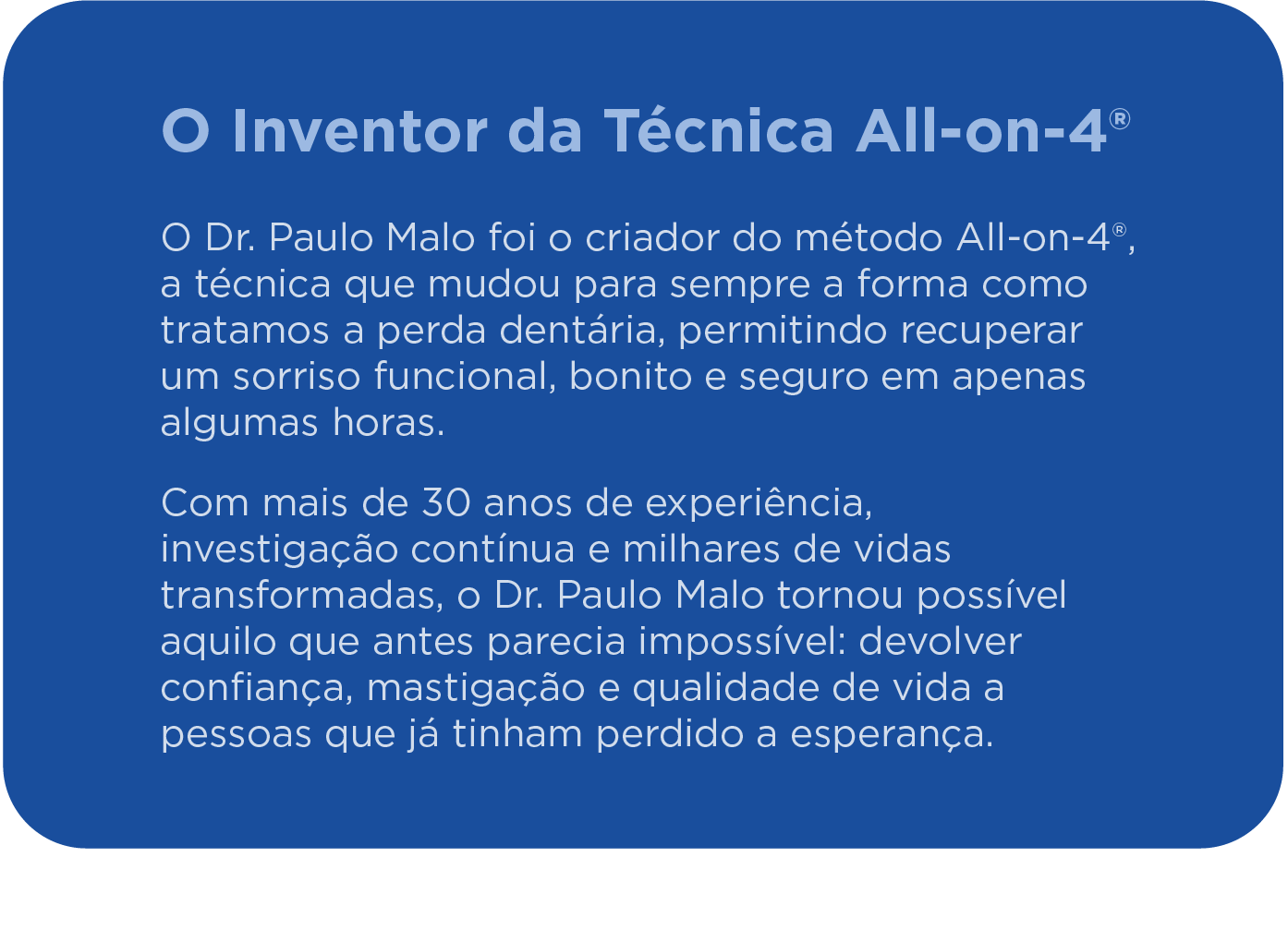 O Dr. Paulo Malo é uma referência global em Implantologia e Reabilitação Oral, responsável pelo desenvolvimento da técnica All-on-4®, que revolucionou o tratamento de pacientes totalmente edêntulos. Com mais de três décadas de carreira, dezenas de publicações científicas, patentes internacionais e presença em mais de 20 países, é um dos nomes mais influentes na Medicina Dentária contemporânea.